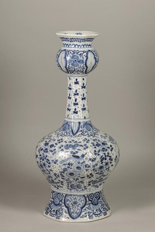 Вазы декоративные. 1. Ваза с крышкой. Голландия (?). XIX в. (?). Фаянс, роспись подглазурная. Высота с крышкой – 29,9 см. 2.Ваза в виде двойной тыквы. Голландия (?). XIX в. (?). Фаянс, роспись подглазурная. Выс. 53 см, диам. верх. 12 см., диам. нижн. 20 см.