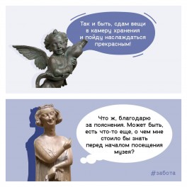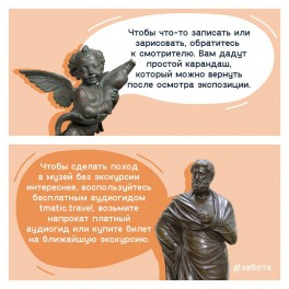 Для детей и подростков, которые только начинают знакомство с музеем, мы приготовили мультфильмы (будут выходить каждую неделю по средам), бумажный комикс-раскраску (в течение месяца его можно бесплатно получить в музее на стойке информации или на контроле билетов), а также специальные занятия, посвященные правилам посещения и этикету в музее.