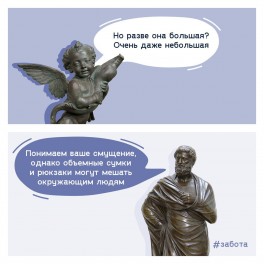 Очень часто посетители просят нас сделать исключение, ведь кажется, что от одной куртки или бутылки с водой ничего не произойдет, но все посетители находятся в равных условиях. Ежедневно к нам приходит несколько тысяч человек: тысячи курток или бутылок с водой, попавших в экспозицию, нанесут непоправимый вред нашей коллекции.