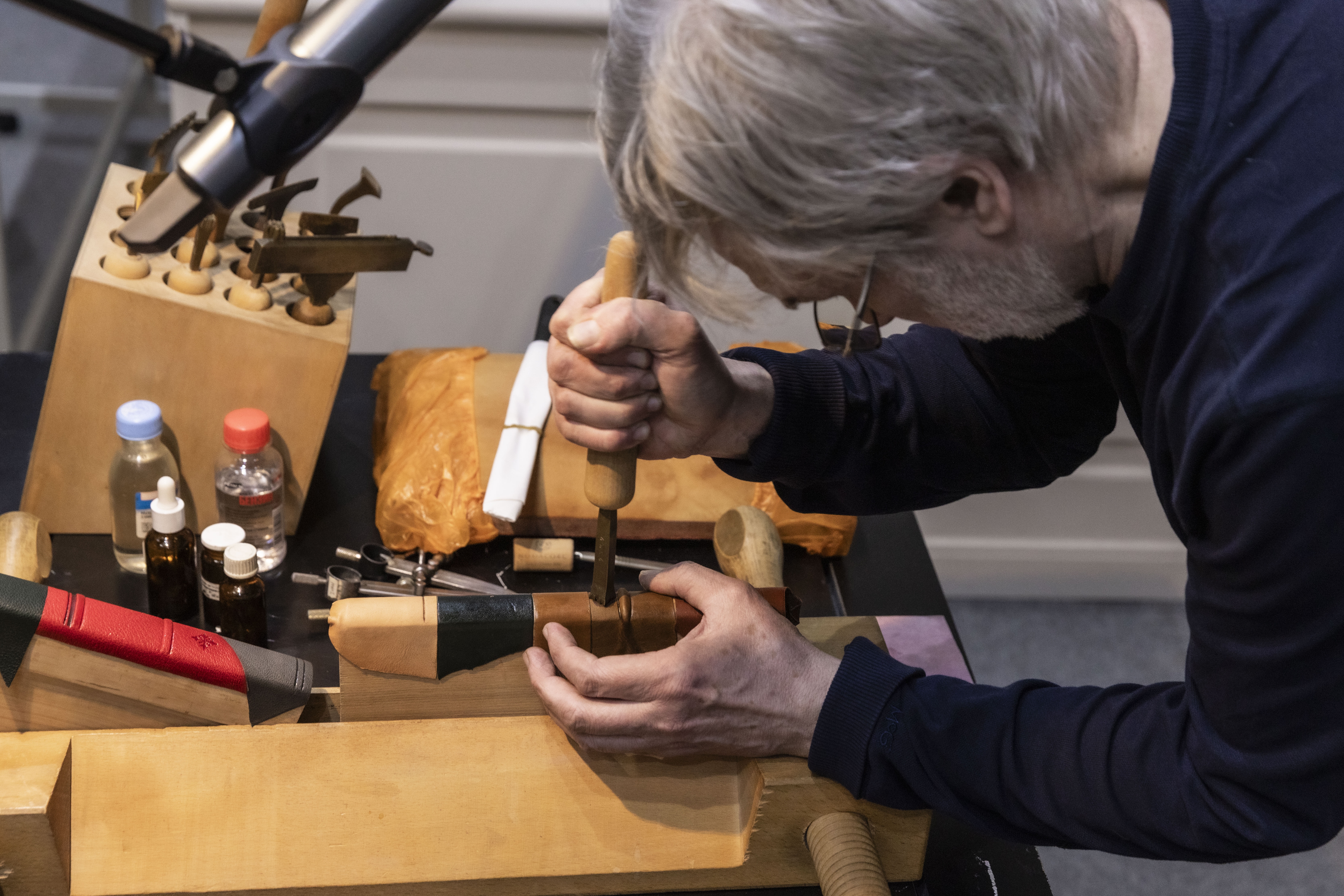 В рамках утреннего модуля были прочитаны мини-лекции о конструкциях, материалах и техниках декоративного оформления европейских книжных переплетов. В завершение утреннего модуля был показан процесс декоративного тиснения сусальным золотом по коже.