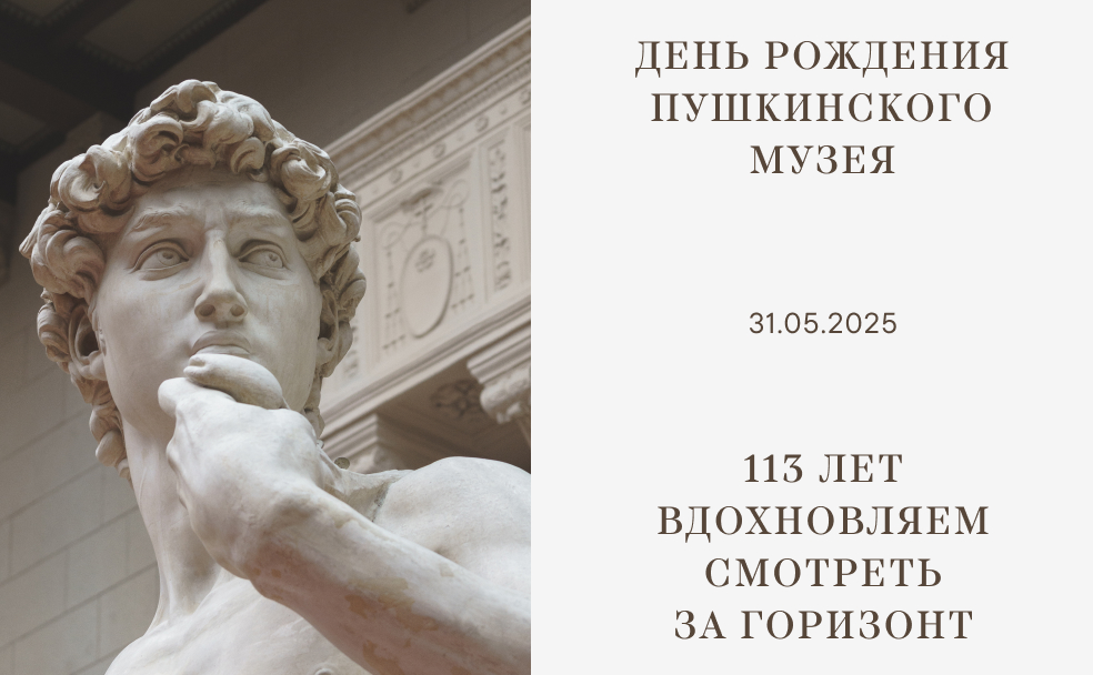 Государственный музей изобразительных искусств имени А.С. Пушкина отмечает 113 лет со дня открытия. К этой дате Пушкинский музей подготовил программу специальных мероприятий с 30 мая по 1 июня: авторские экскурсии от актрисы Марии Мацель и режиссера Сергея Ильина, премьеру аудиосериала «Голоса Пушкинского музея: хранители о шедеврах постоянной экспозиции», а также специальный показ серии киноальманаха «Живые Мемории. Отцы и дети», основанной на мемуарах Марины Цветаевой и прочитанной актрисой Юлией Снигирь. Гости музея также смогут принять участие в открытом мастер-классе под руководством глухих профессиональных художников и в арт-медиациях на национальных языках.