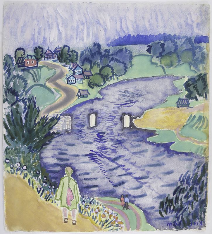 Маврина-Лебедева Т.А. Летний пейзаж с рекой. 1958. На обороте – букет цветов в вазе. Гуашь. 503х450