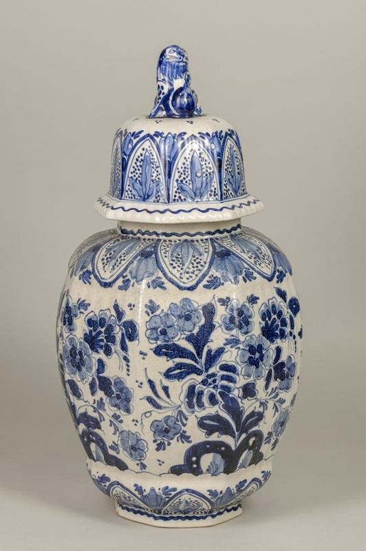 Вазы декоративные. 1. Ваза с крышкой. Голландия (?). XIX в. (?). Фаянс, роспись подглазурная. Высота с крышкой – 29,9 см. 2.Ваза в виде двойной тыквы. Голландия (?). XIX в. (?). Фаянс, роспись подглазурная. Выс. 53 см, диам. верх. 12 см., диам. нижн. 20 см.