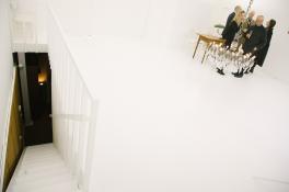 Задача проекта продемонстрировать, что личность человека отделима от миссии директора музея. Именно поэтому архитектор Александр Бродский задумал разделить кабинет на две части. Нижняя – это некий сконцентрированный образ музея с его атрибутами: полумрак, лабиринт шкафов, стеллажей и предметов искусства. Под потолком – пустая, ярко освещенная комната с письменным столом, стулом и личными вещами Марины Лошак. Эти два уровня, два пространства существуют параллельно и соединены лестницей.