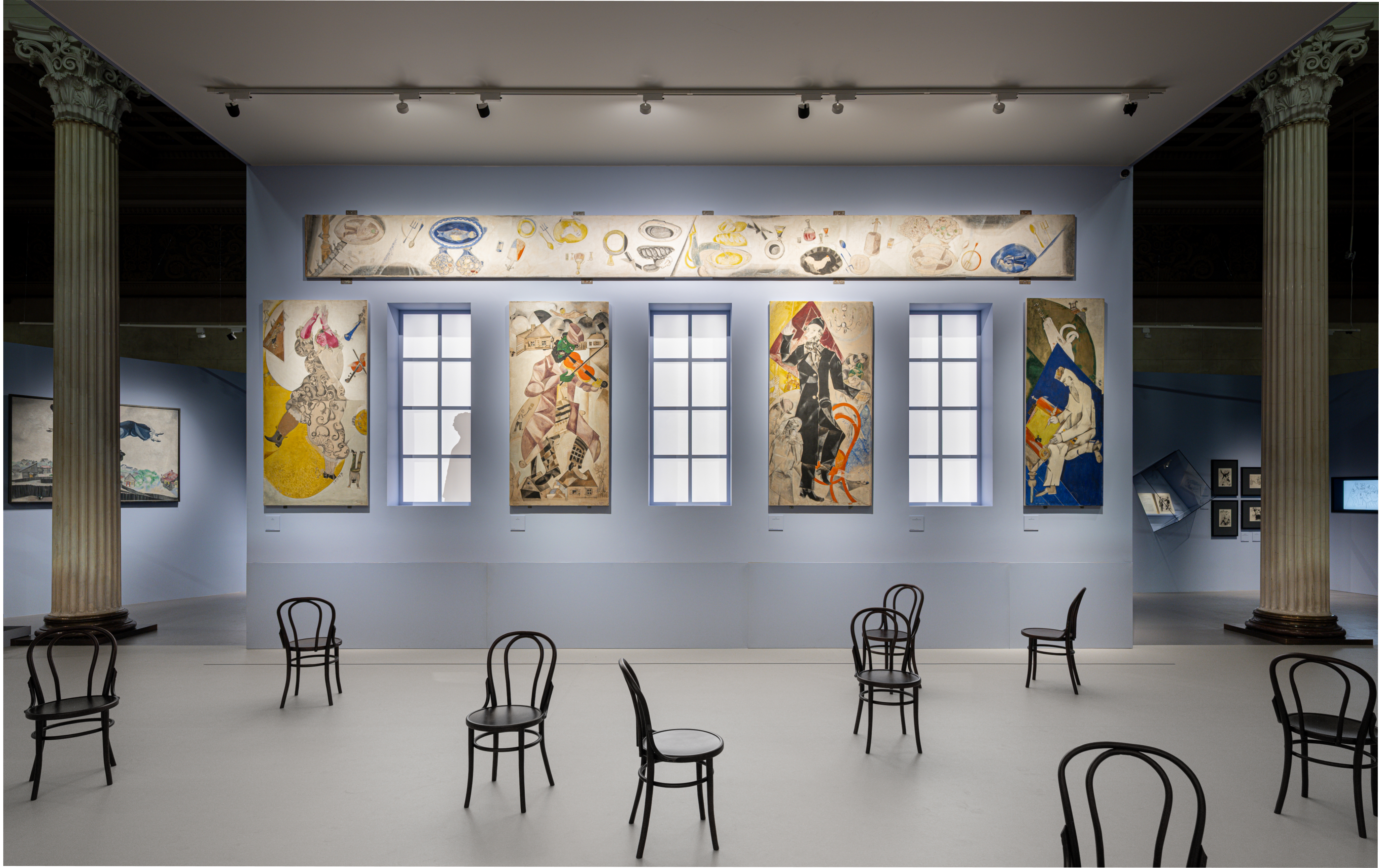 Центральное место на выставке «Марк Шагал. Радость земного притяжения» занимают произведения, созданные Шагалом в начале 1920-х годов для оформления Государственного еврейского камерного театра. Эта работа стала для художника особым пространством эксперимента: его живописный язык вышел за пределы холста и обрел форму сценического образа.
