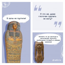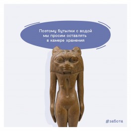 Очень часто посетители просят нас сделать исключение, ведь кажется, что от одной куртки или бутылки с водой ничего не произойдет, но все посетители находятся в равных условиях. Ежедневно к нам приходит несколько тысяч человек: тысячи курток или бутылок с водой, попавших в экспозицию, нанесут непоправимый вред нашей коллекции.