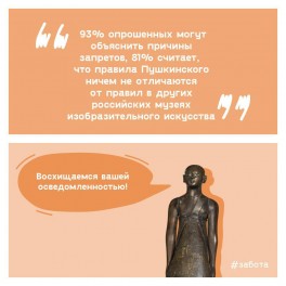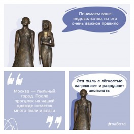 Пушкинский музей обладает уникальной коллекцией, и мы хотим, чтобы все желающие могли любоваться ею как можно дольше. Для этого в музее установлены правила и ограничения, позволяющие сберечь хрупкие и уязвимые экспонаты. Разрабатывая правила посещения, мы ищем баланс между требованиями к хранению произведений искусства и комфортом гостей.