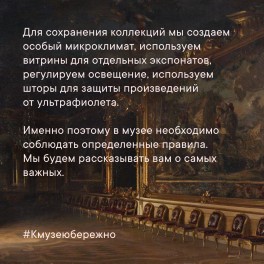 В течение месяца на этой странице сайта и в социальных сетях мы будем рассказывать о правилах посещения и этикете в музее. Публикации будут объединены хештегом #Кмузеюбережно.
